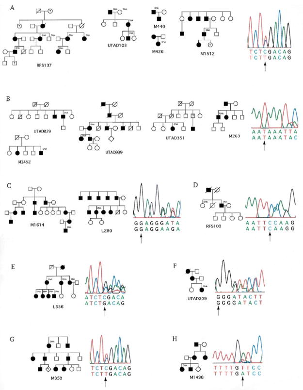 Retinitis pigmentosa is a genetically heterogeneous form of retinal degeneration that affects approximately 1 in 3500 people worldwide. Recently we identified the gene responsible for the RP1 form of autosomal dominant retinitis pigmentosa (adRP) at 8q11-12 and found two different nonsense mutations in three families previously mapped to 8q. The RP1 gene is an unusually large protein, 2156 amino acids in length, but is comprised of four exons only. To determine the frequency and range of mutations in RP1 we screened probands from 56 large adRP families for mutations in the entire gene. After preliminary results indicated that mutations seem to cluster in a 442 nucleotide segment of exon 4, an additional 194 probands with adRP and 409 probands with other degenerative retinal diseases were tested for mutations in this region alone. We identified eight different disease-causing mutations in 17 of the 250 adRP probands tested. All of these mutations are either nonsense or frameshift mutations and lead to a severely truncated protein. Two of the eight different mutations, Arg677X and a 5 bp deletion of nucleotides 2280-2284, were reported previously, while the remaining six mutations are novel. We also identified two rare missense changes in two other families, one new polymorphic amino acid substitution, one silent substitution and a rare variant in the 5'-untranslated region that is not associated with disease. Based on this study, mutations in RP1 appear to cause at least 7% (17/250) of adRP. The 5 bp deletion of nucleotides 2280-2284 and the Arg677X nonsense mutation account for 59% (10/17) of these mutations. Further studies will determine whether missense changes in the RP1 gene are associated with disease, whether mutations in other regions of RP1 can cause forms of retinal disease other than adRP and whether the background variation in either the mutated or wild-type RP1 allele plays a role in the disease phenotype.