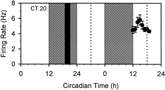 Temperature compensation and the effects of heat pulses on rhythm phase were assessed in the suprachiasmatic nucleus (SCN). Circadian neuronal rhythms were recorded from the rat SCN at 37 and 31 degrees C in vitro. Rhythm period was 23.9 +/- 0.1 and 23.7 +/- 0.1 hr at 37 and 31 degrees C, respectively; the Q(10) for tau was 0.99. Heat pulses were administered at various circadian times (CTs) by increasing SCN temperature from 34 to 37 degrees C for 2 hr. Phase delays and advances were observed during early and late subjective night, respectively, and no phase shifts were obtained during midsubjective day. Maximum phase delays of 2.2 +/- 0.3 hr were obtained at CT 14, and maximum phase advances of 3.5 +/- 0.2 hr were obtained at CT 20. Phase delays were not blocked by a combination of NMDA [AP-5 (100 microM)] and non-NMDA [CNQX (10 microM)] receptor antagonists or by tetrodotoxin (TTX) at concentrations of 1 or 3 microM. The phase response curve for heat pulses is similar to ones obtained with light pulses for behavioral rhythms. These data demonstrate that circadian pacemaker period in the rat SCN is temperature-compensated over a physiological range of temperatures. Phase delays were not caused by activation of ionotropic glutamate receptors, release of other neurotransmitters, or temperature-dependent increases in metabolism associated with action potentials. Heat pulses may have phase-shifted rhythms by directly altering transcriptional or translational events in SCN pacemaker cells.