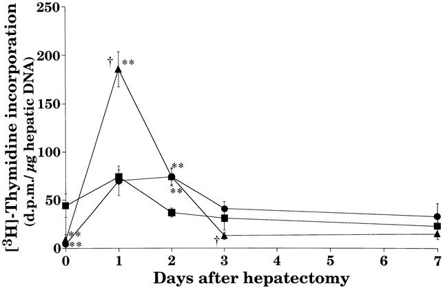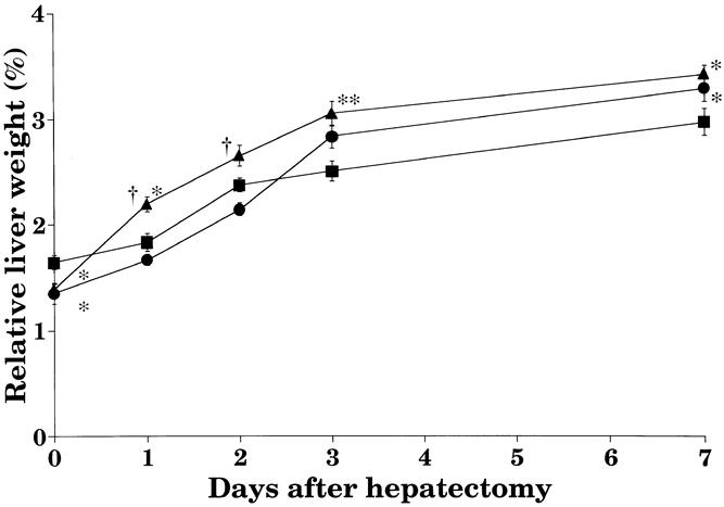 Results: The relative liver weight was significantly higher in the ID-Hx group than in the OJ-Hx group on days 1, 3, and 7 after hepatectomy and than in the ED-Hx group on days 1 and 2. The rate of hepatic DNA synthesis was significantly higher in the ID-Hx group than in the OJ-Hx and ED-Hx groups on day 1. The rate was similar in the ED-Hx and ID-Hx groups on day 2 but was significantly higher than in the OJ-Hx group. The hepatic malondialdehyde concentration was significantly higher on day 1 in the ED-Hx group than in the other two groups. It was lowest in the ID-Hx group throughout the study. Both biliary drainage procedures lowered the portal endotoxin concentration and serum hyaluronic acid concentration at the time of hepatectomy. The serum hyaluronic acid concentration was lowest in the ID Hx group. Hepatic adenine triphosphate concentrations and energy charge levels were similar among the three groups.