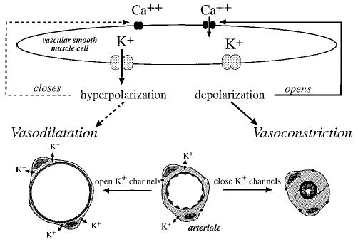 Ion channels in the plasma membrane of vascular muscle cells that form the walls of resistance arteries and arterioles play a central role in the regulation of vascular tone. Current evidence indicates that vascular smooth muscle cells express at least 4 different types of K(+) channels, 1 to 2 types of voltage-gated Ca(2+) channels, >/=2 types of Cl(-) channels, store-operated Ca(+) (SOC) channels, and stretch-activated cation (SAC) channels in their plasma membranes, all of which may be involved in the regulation of vascular tone. Calcium influx through voltage-gated Ca(2+), SOC, and SAC channels provides a major source of activator Ca(2+) used by resistance arteries and arterioles. In addition, K(+) and Cl(-) channels and the Ca(2+) channels mentioned previously all are involved in the determination of the membrane potential of these cells. Membrane potential is a key variable that not only regulates Ca(+2) influx through voltage-gated Ca(2+) channels, but also influences release of Ca(2+) from internal stores and Ca(2+)- sensitivity of the contractile apparatus. By controlling Ca(2+) delivery and membrane potential, ion channels are involved in all aspects of the generation and regulation of vascular tone.