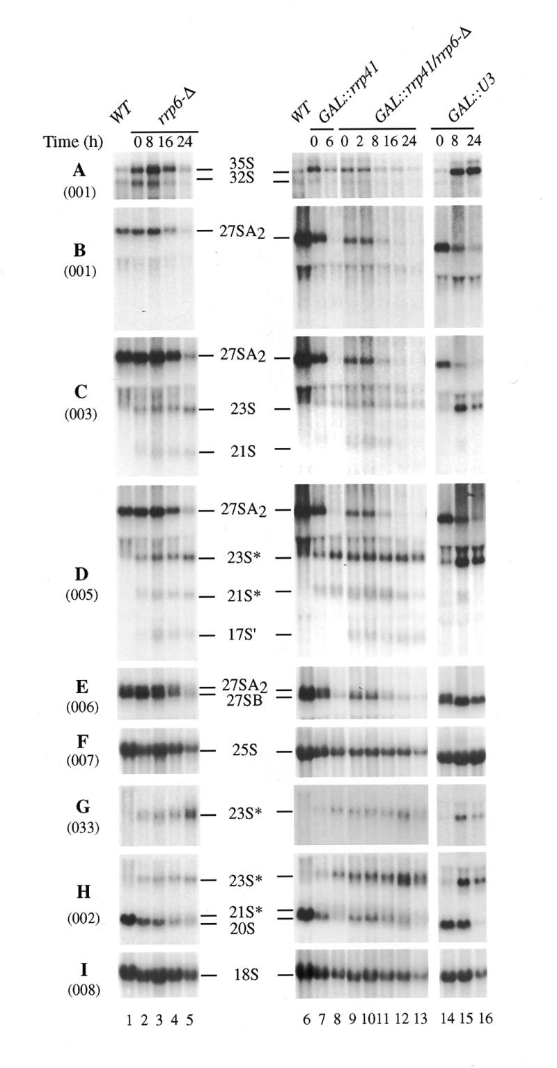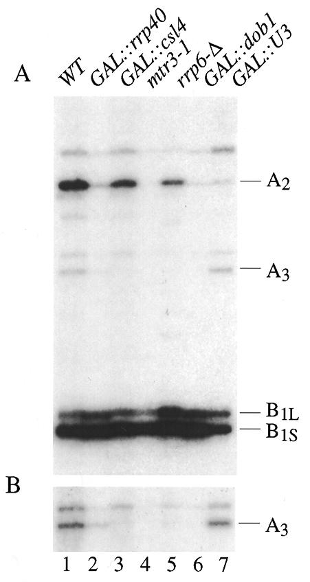 The yeast exosome is a complex of 3'-->5' exonucleases involved in RNA processing and degradation. All 11 known components of the exosome are required during 3' end processing of the 5.8S rRNA. Here we report that depletion of each of the individual components inhibits the early pre-rRNA cleavages at sites A(0), A(1), A(2)and A(3), reducing the levels of the 32S, 20S, 27SA(2)and 27SA(3)pre-rRNAs. The levels of the 27SB pre-rRNAs were also reduced. Consequently, both the 18S and 25S rRNAs were depleted. Since none of these processing steps involves 3'-->5' exonuclease activities, the requirement for the exosome is probably indirect. Correct assembly of trans -acting factors with the pre-ribosomes may be monitored by a quality control system that inhibits pre-rRNA processing. The exosome itself degrades aberrant pre-rRNAs that arise from such inhibition. Exosome mutants stabilize truncated versions of the 23S, 21S and A(2)-C(2)RNAs, none of which are observed in wild-type cells. The putative helicase Dob1p, which functions as a cofactor for the exosome in pre-rRNA processing, also functions in these pre-rRNA degradation activities.