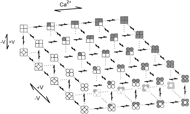 The voltage- and Ca2+-dependent gating mechanism of large-conductance Ca2+-activated K+ (BK) channels from cultured rat skeletal muscle was studied using single-channel analysis. Channel open probability (Po) increased with depolarization, as determined by limiting slope measurements (11 mV per e-fold change in Po; effective gating charge, q(eff), of 2.3 +/- 0.6 e(o)). Estimates of q(eff) were little changed for intracellular Ca2+ (Ca2+(i)) ranging from 0.0003 to 1,024 microM. Increasing Ca2+(i) from 0.03 to 1,024 microM shifted the voltage for half maximal activation (V(1/2)) 175 mV in the hyperpolarizing direction. V(1/2) was independent of Ca2+(i) for Ca2+(i) < or = 0.03 microM, indicating that the channel can be activated in the absence of Ca2+(i). Open and closed dwell-time distributions for data obtained at different Ca2+(i) and voltage, but at the same Po, were different, indicating that the major action of voltage is not through concentrating Ca2+ at the binding sites. The voltage dependence of Po arose from a decrease in the mean closing rate with depolarization (q(eff) = -0.5 e(o)) and an increase in the mean opening rate (q(eff) = 1.8 e(o)), consistent with voltage-dependent steps in both the activation and deactivation pathways. A 50-state two-tiered model with separate voltage- and Ca2+-dependent steps was consistent with the major features of the voltage and Ca2+ dependence of the single-channel kinetics over wide ranges of Ca2+(i) (approximately 0 through 1,024 microM), voltage (+80 to -80 mV), and Po (10(-4) to 0.96). In the model, the voltage dependence of the gating arises mainly from voltage-dependent transitions between closed (C-C) and open (O-O) states, with less voltage dependence for transitions between open and closed states (C-O), and with no voltage dependence for Ca2+-binding and unbinding. The two-tiered model can serve as a working hypothesis for the Ca2+- and voltage-dependent gating of the BK channel.