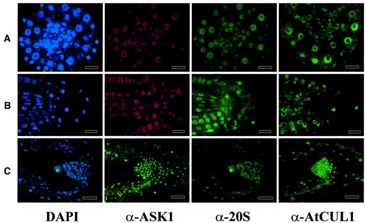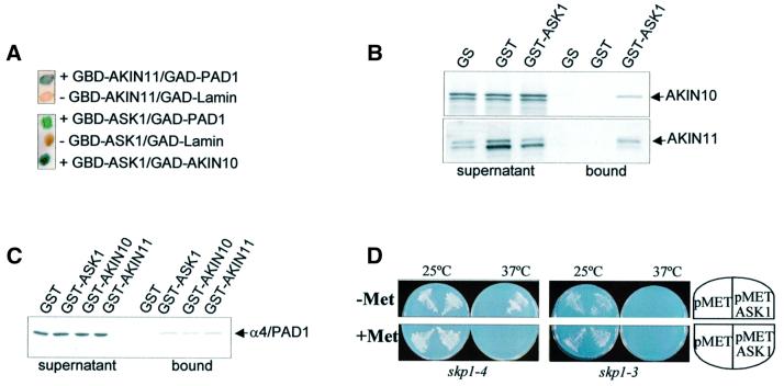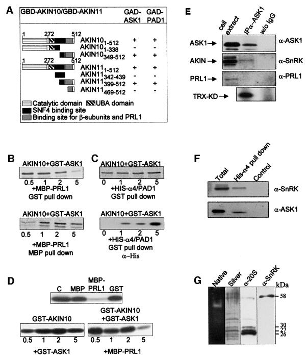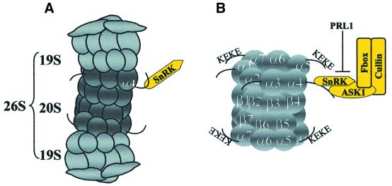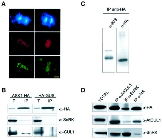 Arabidopsis Snf1-related protein kinases (SnRKs) are implicated in pleiotropic regulation of metabolic, hormonal and stress responses through their interaction with the kinase inhibitor PRL1 WD-protein. Here we show that SKP1/ASK1, a conserved SCF (Skp1-cullin-F-box) ubiquitin ligase subunit, which suppresses the skp1-4 mitotic defect in yeast, interacts with the PRL1-binding C-terminal domains of SnRKs. The same SnRK domains recruit an SKP1/ASK1-binding proteasomal protein, alpha4/PAD1, which enhances the formation of a trimeric SnRK complex with SKP1/ASK1 in vitro. By contrast, PRL1 reduces the interaction of SKP1/ASK1 with SnRKs. SKP1/ASK1 is co-immunoprecipitated with a cullin SCF subunit (AtCUL1) and an SnRK kinase, but not with PRL1 from Arabidopsis cell extracts. SKP1/ASK1, cullin and proteasomal alpha-subunits show nuclear co-localization in differentiated Arabidopsis cells, and are observed in association with mitotic spindles and phragmoplasts during cell division. Detection of SnRK in purified 26S proteasomes and co-purification of epitope- tagged SKP1/ASK1 with SnRK, cullin and proteasomal alpha-subunits indicate that the observed protein interactions between SnRK, SKP1/ASK1 and alpha4/PAD1 are involved in proteasomal binding of an SCF ubiquitin ligase in Arabidopsis.