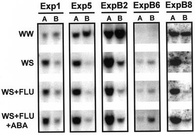 We previously demonstrated that maintenance of cell elongation in the apical region of maize primary roots at low water potentials (psi(w)) was associated with an increase in expansin activity and extractable expansin protein. Here, we characterized the spatial pattern of expansin gene expression along the growing maize root and studied the effect of low psi(w) on expansin gene expression. Roots were divided into three segments: apical 0 to 5 mm, subapical 5 to 10 mm, and non-growing 10 to 20 mm. Of the five expansin genes expressed in control roots, two alpha-expansins (Exp1 and Exp5) and two beta-expansins (ExpB2 and ExpB8) are expressed specifically in the growing region, whereas expression of beta-expansin ExpB6 is shifted basipetally. After seedlings were transplanted to vermiculite with a psi(w) of -1.6 MPa, transcripts for Exp1, Exp5, and ExpB8 rapidly accumulated in the apical region of the root. These mRNA changes correlated with the maintenance of root elongation and increases in wall extensibility found previously. The beta-expansins ExpB2 and ExpB6 showed distinctive patterns of expression and responses to low psi(w,) indicative of distinctive functions. Inhibition of abscisic acid (ABA) accumulation at low psi(w) (by fluridone treatment) had no effect on expansin expression, except that ExpB2 transcript level showed a minor dependence on ABA. Gene-specific regulation of alpha- and beta-expansin mRNA pools likely contributes to growth alterations of the maize (Zea mays) root as it adapts to a low psi(w), but these changes do not appear to be mediated by changes in ABA content.