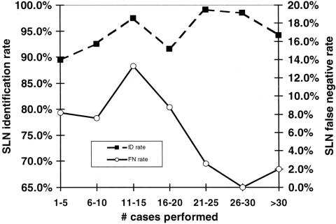Summary background data: Before abandoning routine axillary dissection in favor of SLN biopsy for breast cancer, each surgeon and institution must document acceptable SLN identification and false-negative rates. Although some studies have examined the impact of individual surgeon experience on the SLN identification rate, minimal data exist to determine the optimal experience required to minimize the more crucial false-negative rate.