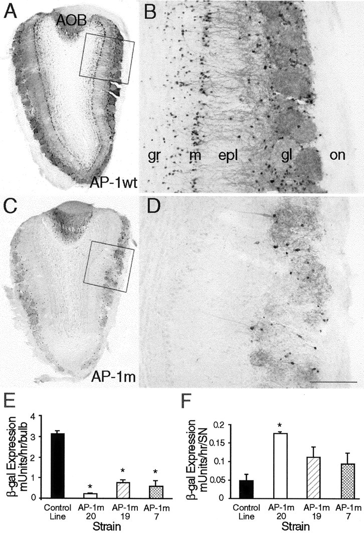 A possible source for transplantable neurons in Parkinson's disease are adult olfactory bulb (OB) dopamine (DA) progenitors that originate in the anterior subventricular zone and reach the OB through the rostral migratory stream. We used adult transgenic mice expressing a lacZ reporter directed by an 8.9 kb tyrosine hydroxylase (TH) promoter to investigate the course of DAergic differentiation. Parallel transgene and intrinsic TH mRNA expression occurred during migration of DA interneurons through the mitral and superficial granule cell layers before these cells reached their final periglomerular position. Differential transgene and calcium-calmodulin-dependent protein kinase IV expression distinguished two nonoverlapping populations of interneurons. Transgenic mice carrying a TH8.9kb/lacZ construct with a mutant AP-1 site demonstrated that this element confers OB DA-specific TH gene regulation. These results indicate that DA phenotypic determination is specific to a subset of mobile OB progenitors.
