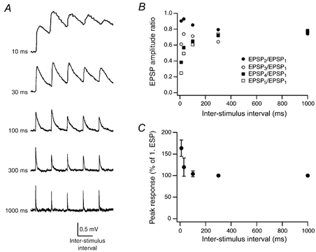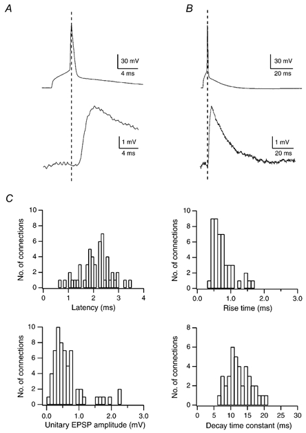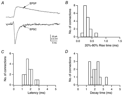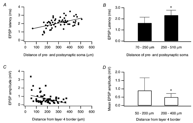 Whole-cell voltage recordings were obtained from 64 synaptically coupled excitatory layer 4 (L4) spiny neurones and L2/3 pyramidal cells in acute slices of the somatosensory cortex ('barrel' cortex) of 17- to 23-days-old rats. Single action potentials (APs) in the L4 spiny neurone evoked single unitary EPSPs in the L2/3 pyramidal cell with a peak amplitude of 0.7 +/- 0.6 mV. The average latency was 2.1 +/- 0.6 ms, the rise time was 0.8 +/- 0.3 ms and the decay time constant was 12.7 +/- 3.5 ms. The percentage of failures of an AP in a L4 spiny neurone to evoke a unitary EPSP in the L2/3 pyramidal cell was 4.9 +/- 8.8 % and the coefficient of variation (c.v.) of the unitary EPSP amplitude was 0.27 +/- 0.13. Both c.v. and percentage of failures decreased with increased average EPSP amplitude. Postsynaptic glutamate receptors (GluRs) in L2/3 pyramidal cells were of the N-methyl-D-aspartate (NMDA) receptor (NMDAR) and the non-NMDAR type. At -60 mV in the presence of extracellular Mg2+ (1 mM), 29 +/- 15 % of the EPSP voltage-time integral was blocked by NMDAR antagonists. In 0 Mg2+, the NMDAR/AMPAR ratio of the EPSC was 0.50 +/- 0.29, about half the value obtained for L4 spiny neurone connections. Burst stimulation of L4 spiny neurones showed that EPSPs in L2/3 pyramidal cells depressed over a wide range of frequencies (1-100 s(-1) ). However, at higher frequencies (30 s(-1)) EPSP summation overcame synaptic depression so that the summed EPSP was larger than the first EPSP amplitude in the train. The number of putative synaptic contacts established by the axonal collaterals of the L4 projection neurone with the target neurone in layer 2/3 varied between 4 and 5, with an average of 4.5 +/- 0.5 (n = 13 pairs). Synapses were established on basal dendrites of the pyramidal cell. Their mean geometric distance from the pyramidal cell soma was 67 +/- 34 microm (range, 16-196 microm). The results suggest that each connected L4 spiny neurone produces a weak but reliable EPSP in the pyramidal cell. Therefore transmission of signals to layer 2/3 is likely to have a high threshold requiring simultaneous activation of many L4 neurons, implying that L4 spiny neurone to L2/3 pyramidal cell synapses act as a gate for the lateral spread of excitation in layer 2/3.