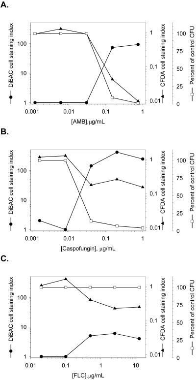 Caspofungin acetate is an antifungal antibiotic that inhibits synthesis of 1,3-beta-D-glucan, an essential component of the fungal cell wall. While caspofungin causes cell death in yeasts and dimorphic fungi such as Candida albicans, its effect on Aspergillus fumigatus is less well understood. We used the fluorescent dyes 5,(6)-carboxyfluorescein diacetate (CFDA) and bis-(1,3-dibutylbarbituric acid) trimethine oxonol (DiBAC), which stain live and dead cells, respectively, to further characterize the antifungal activity of caspofungin. For comparison, compounds whose mode of action was either fungistatic (fluconazole, itraconazole) or fungicidal (amphotericin B) were also evaluated. A correlation between caspofungin-induced loss of viability, decreased CFDA staining, and increased DiBAC staining was established first with C. albicans. For A. fumigatus, caspofungin caused similar dye-staining changes, which were quantified by fluorimetric analysis of stained hyphae grown in a medium that promoted dispersed growth. The minimum concentration of caspofungin required to produce these changes also decreased the level of growth-dependent reduction of the indicator dye Alamar Blue. We observed a differential effect of caspofungin as a function of cell position: 88% of apical cells and 61% of subapical branching cells failed to stain with the viable dye CFDA, but only 24% of subapical cells were unstained. Complementary results were seen with germlings from DiBAC-stained, caspofungin-treated cultures. Extended incubation of A. fumigatus with a single dose of caspofungin affected the same proportion of apical and subapical branching cells for up to 72 h. The dye-staining patterns illustrate that the cells at the active centers for new cell wall synthesis within A. fumigatus hyphae are killed when they are exposed to caspofungin.