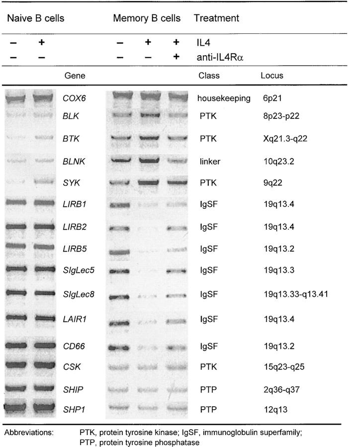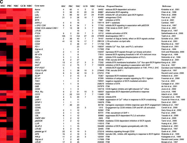To identify changes in the regulation of B cell receptor (BCR) signals during the development of human B cells, we generated genome-wide gene expression profiles using the serial analysis of gene expression (SAGE) technique for CD34(+) hematopoietic stem cells (HSCs), pre-B cells, naive, germinal center (GC), and memory B cells. Comparing these SAGE profiles, genes encoding positive regulators of BCR signaling were expressed at consistently lower levels in naive B cells than in all other B cell subsets. Conversely, a large group of inhibitory signaling molecules, mostly belonging to the immunoglobulin superfamily (IgSF), were specifically or predominantly expressed in naive B cells. The quantitative differences observed by SAGE were corroborated by semiquantitative reverse transcription-polymerase chain reaction (RT-PCR) and flow cytometry. In a functional assay, we show that down-regulation of inhibitory IgSF receptors and increased responsiveness to BCR stimulation in memory as compared with naive B cells at least partly results from interleukin (IL)-4 receptor signaling. Conversely, activation or impairment of the inhibitory IgSF receptor LIRB1 affected BCR-dependent Ca(2+) mobilization only in naive but not memory B cells. Thus, LIRB1 and IL-4 may represent components of two nonoverlapping gene expression programs in naive and memory B cells, respectively: in naive B cells, a large group of inhibitory IgSF receptors can elevate the BCR signaling threshold to prevent these cells from premature activation and clonal expansion before GC-dependent affinity maturation. In memory B cells, facilitated responsiveness upon reencounter of the immunizing antigen may result from amplification of BCR signals at virtually all levels of signal transduction.