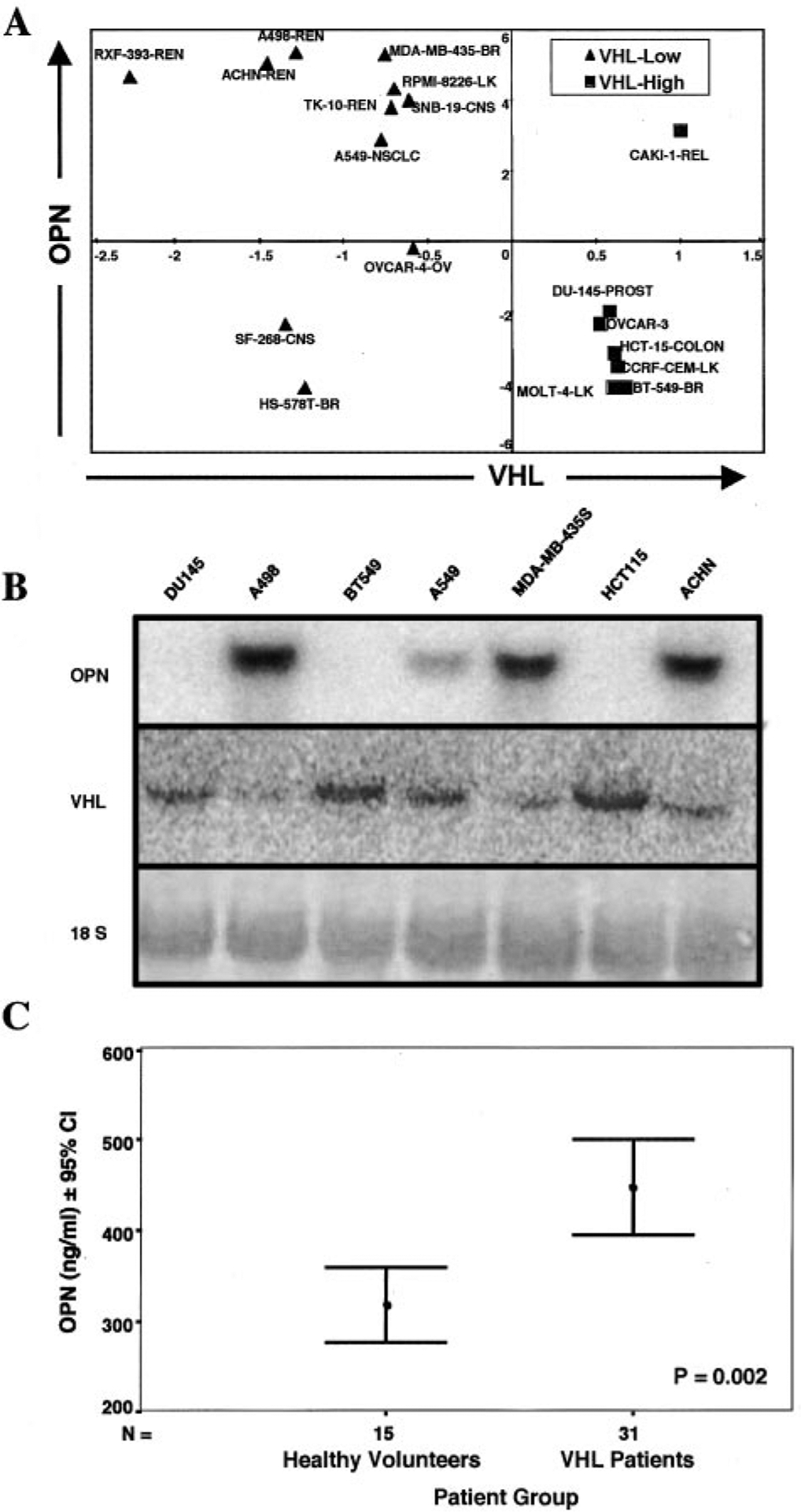 Results: Microarray analysis indicated that OPN gene expression inversely correlated with that of VHL. These findings were confirmed by Northern blot analysis. ELISA studies and Western blot in a HNSCC cell line demonstrated that hypoxia exposure resulted in increased OPN secretion. Patients with VHL syndrome had significantly higher plasma OPN levels than healthy volunteers. Plasma OPN level inversely correlated with tumor pO(2) (P = 0.003, r = -0.42). OPN levels correlated with clinical outcomes. The 1-year FFR and survival rates were 80 and 100%, respectively, for patients with OPN levels <or=450 ng/ml and 43 and 63%, respectively, for levels >450 ng/ml (P = 0.002 and 0.0005). Multivariate analysis revealed that OPN was an independent predictor for FFR and survival.