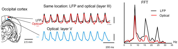 Neocortical "theta" oscillation (5-12 Hz) has been observed in animals and human subjects but little is known about how the oscillation is organized in the cortical intrinsic networks. Here we use voltage-sensitive dye and optical imaging to study a carbachol/bicuculline induced theta ( approximately 8 Hz) oscillation in rat neocortical slices. The imaging has large signal-to-noise ratio, allowing us to map the phase distribution over the neocortical tissue during the oscillation. The oscillation was organized as spontaneous epochs and each epoch was composed of a "first spike," a "regular" period (with relatively stable frequency and amplitude), and an "irregular" period (with variable frequency and amplitude) of oscillations. During each cycle of the regular oscillation, one wave of activation propagated horizontally (parallel to the cortical lamina) across the cortical section at a velocity of approximately 50 mm/s. Vertically the activity was synchronized through all cortical layers. This pattern of one propagating wave associated with one oscillation cycle was seen during all the regular cycles. The oscillation frequency varied noticeably at two neighboring horizontal locations (330 microm apart), suggesting that the oscillation is locally organized and each local oscillator is about </=300 microm wide horizontally. During irregular oscillations, the spatiotemporal patterns were complex and sometimes the vertical synchronization decomposed, suggesting a de-coupling among local oscillators. Our data suggested that neocortical theta oscillation is sustained by multiple local oscillators. The coupling regime among the oscillators may determine the spatiotemporal pattern and switching between propagating waves and irregular patterns.