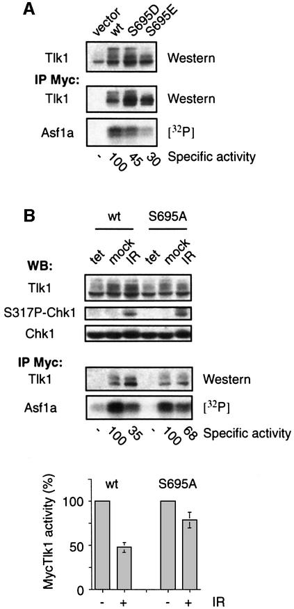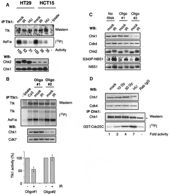 All eukaryotes respond to DNA damage by modulation of diverse cellular processes to preserve genomic integrity and ensure survival. Here we identify mammalian Tousled like kinases (Tlks) as a novel target of the DNA damage checkpoint. During S-phase progression, when Tlks are maximally active, generation of DNA double-strand breaks (DSBs) leads to rapid and transient inhibition of Tlk activity. Experiments with chemical inhibitors, genetic models and gene targeting through RNA interference demonstrate that this response to DSBs requires ATM and Chk1 function. Chk1 phosphorylates Tlk1 on serine 695 (S695) in vitro, and this UCN-01- and caffeine-sensitive site is phosphorylated in vivo in response to DNA damage. Substitution of S695 to alanine impaired efficient downregulation of Tlk1 after DNA damage. These findings identify an unprecedented functional co- operation between ATM and Chk1 in propagation of a checkpoint response during S phase and suggest that, through transient inhibition of Tlk kinases, the ATM-Chk1-Tlk pathway may regulate processes involved in chromatin assembly.