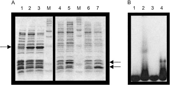 SDS-PAGE analysis of DosR expression in E. coli. The dosR coding sequence was cloned into a pET expression vector, and expression was induced by IPTG. Lanes (1–3) full length: 1, uninduced; 2, induced for 2 h; 3, induced for 5 h; lanes (4–5) amino acids 1–134: 4, uninduced; 5, induced for 5 h; lanes (6–7) amino acids 144–217: 6, uninduced; 7, induced for 5 h. Arrows indicate the position at which DosR is expected to migrate.