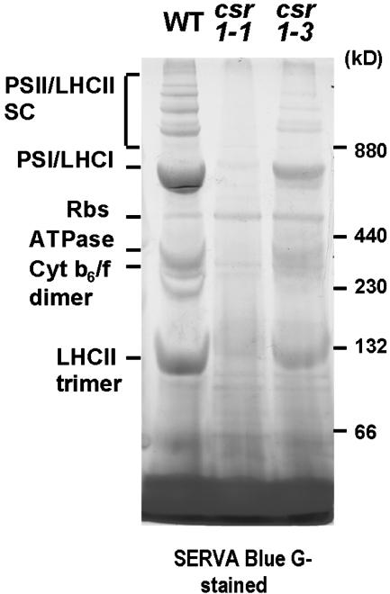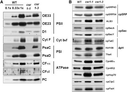 A chloroplast signal recognition particle (SRP) that is related to the SRP involved in secretion in bacteria and eukaryotic cells is used for the insertion of light-harvesting chlorophyll proteins (LHCPs) into the thylakoid membranes. A conserved component of the SRP mechanism is a membrane-bound SRP receptor, denoted FtsY in bacteria. Plant genomes encode FtsY homologs that are targeted to the chloroplast (cpFtsY). To investigate the in vivo roles of cpFtsY, we characterized maize cpFtsY and maize mutants having a Mu transposon insertion in the corresponding gene (chloroplast SRP receptor1, or csr1). Maize cpFtsY accumulates to much higher levels in leaf tissue than in roots and stems. Interestingly, it is present at similar levels in etiolated and green leaf tissue and was found to bind the prolamellar bodies of etioplasts. A null cpFtsY mutant, csr1-1, showed a substantial loss of leaf chlorophyll, whereas a "leaky" allele, csr1-3, conditioned a more moderate chlorophyll deficiency. Both alleles caused the loss of various LHCPs and the thylakoid-bound photosynthetic enzyme complexes and were seedling lethal. By contrast, levels of the membrane-bound components of the thylakoid protein transport machineries were not altered. The thylakoid membranes in csr1-1 chloroplasts were unstacked and reduced in abundance, but the prolamellar bodies in mutant etioplasts appeared normal. These results demonstrate the essentiality of cpFtsY for the biogenesis not only of the LHCPs but also for the assembly of the other membrane-bound components of the photosynthetic apparatus.