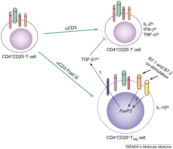 Recent studies by Chatenoud and co-workers suggest that non-mitogenic F(ab′)2 fragments of anti-CD3 antibodies, which cannot bind the Fc receptor, induce a prolonged period of tolerance and prevent diabetes in nonobese diabetic (NOD) mice. Tolerance is established by regulatory T cells through the production of transforming growth factor-β1 (TGF-β1), but the mechanism by which TGF-β1 confers this activity is unclear. Analysis of mice deficient in TGF-β1 suggests that TGF-β1 raises the threshold at which intracellular calcium activates T cells to a level that prevents an autoimmune response.