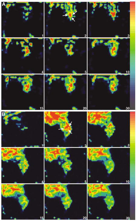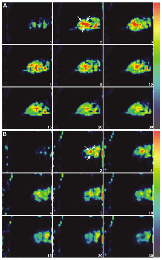 Representative FASTSPECT dynamic images (selected coronal slices) from two mice with MCF7/S breast tumor (A) and MCF7/D40 tumor (B) using 99mTc-sestamibi. The time after injection is shown in the lower right corner of each image. The MCF7/S tumor (arrow) was visualized about 2 min post-injection and stayed well-defined for at least 30 min. The MCF7/D40 tumor (arrow) was visible for only about 2–3 min post-injection. The tumor weight was 0.084 g (MCF7/S) and 0.15 g (MCF7/D40). The ratio of tumor/muscle was 1.45 (MCF7/S) and 0.72 (MCF7/D40) determined by biodistribution analysis at the end of imaging session.