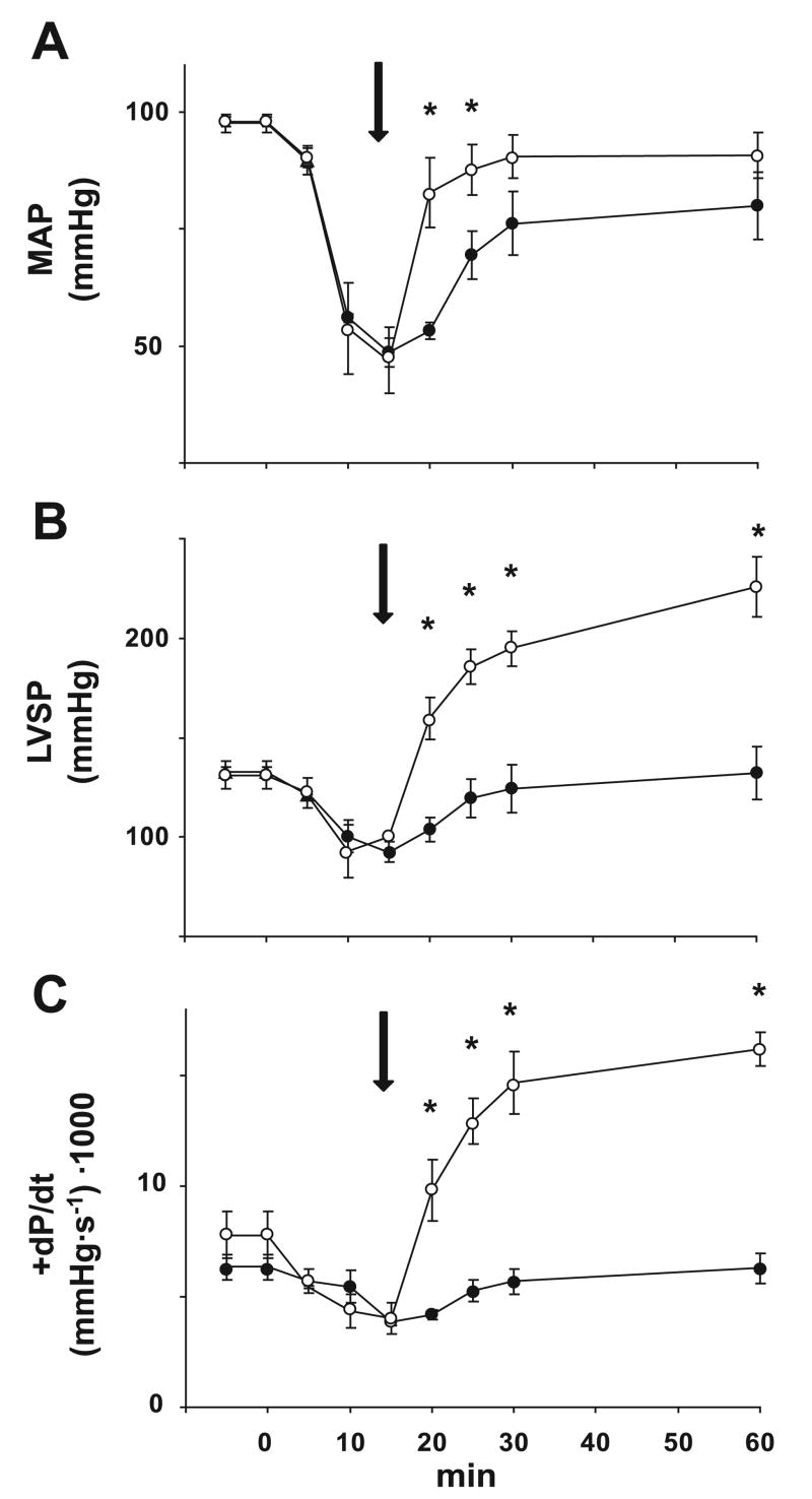 Endocannabinoids and CB1 receptors have been implicated in endotoxin (LPS)-induced hypotension: LPS stimulates the synthesis of anandamide in macrophages, and the CB1 antagonist SR-141716 inhibits the hypotension induced by treatment of rats with LPS or LPS-treated macrophages. Recent evidence indicates the existence of cannabinoid receptors distinct from CB1 or CB2 that are inhibited by SR-141716 but not by other CB1 antagonists such as AM251. In pentobarbital-anesthetized rats, intravenous injection of 10 mg/kg LPS elicited hypotension associated with profound decreases in cardiac contractility, moderate tachycardia, and an increase in lower body vascular resistance. Pretreatment with 3 mg/kg SR-141716 prevented the hypotension and decrease in cardiac contractility, slightly attenuated the increase in peripheral resistance, and had no effect on the tachycardia caused by LPS, whereas pretreatment with 3 mg/kg AM251 did not affect any of these responses. SR-141716 also elicited an acute reversal of the hypotension and decreased contractility when administered after the response to LPS had fully developed. The LPS-induced hypotension and its inhibition by SR-141716 were similar in pentobarbital-anesthetized wild-type, CB1(-/-), and CB1(-/-)/CB2(-/-) mice. We conclude that SR-141716 inhibits the acute hemodynamic effects of LPS by interacting with a cardiac receptor distinct from CB1 or CB2 that mediates negative inotropy and may be activated by anandamide or a related endocannabinoid released during endotoxemia.