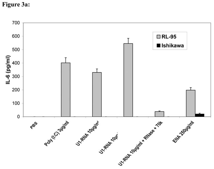 Results: Treatment with U1 RNA or with poly(I-C), a known agonist of TLR-3, induced approximately twice as much control splenocyte proliferation as did treatment with RNase-digested U1 RNA. Proliferation in response to either poly(I-C) or U1 RNA by MyD88-knockout splenocytes was similarly attenuated. Similar to poly(I-C), U1 RNA induced significant secretion of both IL-6 and IL-8 from a TLR-3-expressing human cell line; in contrast, the TLR-5 agonist flagellin induced predominantly IL-8 secretion. Pretreatment of U1 RNA with RNase abolished IL-6 and IL-8 secretion.
