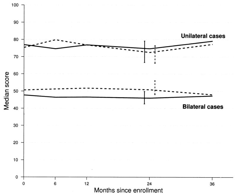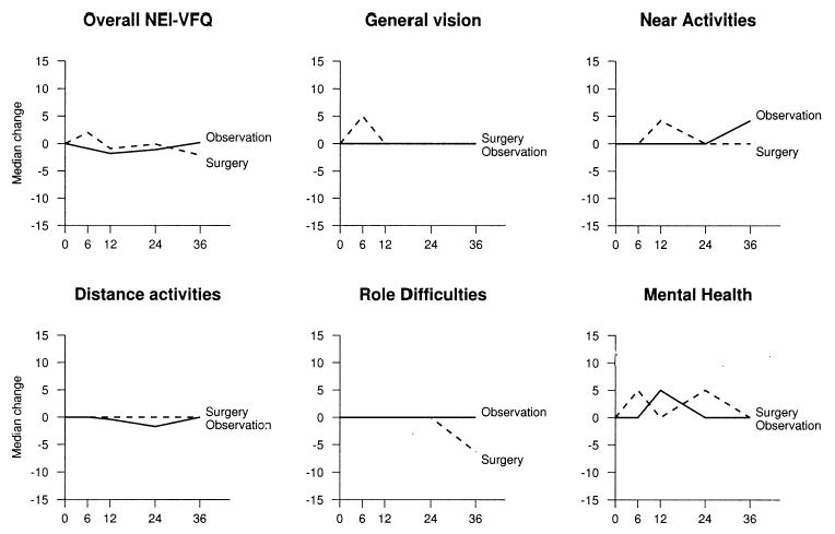 Results: At 24 months after enrollment, overall NEI-VFQ scores had a median decrease of 1 point from baseline in the observation arm (95% confidence interval [CI]: -4 to 3 points) and no change in the surgery arm (95% CI: -3 to 3 points) (P = 0.70). Changes from baseline on NEI-VFQ subscales also were similar between treatment arms. Differences in scores by unilateral or bilateral involvement seen at baseline in each treatment arm persisted throughout follow-up for most outcomes. Planned analyses stratified by VA showed trends (P = 0.17) in favor of surgery at 24 months in the patients with baseline VA greater than 20/200 for the NEI-VFQ scale (3.5-point median increase from baseline in the surgery arm [95% CI: -4 to 7] vs. a 1-point median loss from baseline in the observation arm [95% CI: -6 to 4]).