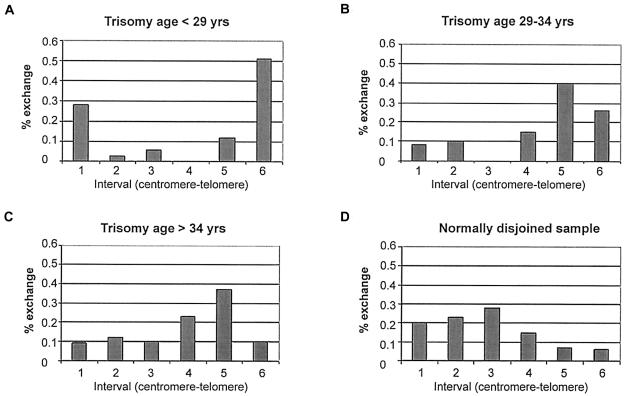 Altered genetic recombination has been identified as the first molecular correlate of chromosome nondisjunction in both humans and model organisms. Little evidence has emerged to link maternal age--long recognized as the primary risk factor for nondisjunction--with altered recombination, although some studies have provided hints of such a relationship. To determine whether an association does exist, chromosome 21 recombination patterns were examined in 400 trisomy 21 cases of maternal meiosis I origin, grouped by maternal age. These recombination patterns were used to predict the chromosome 21 exchange patterns established during meiosis I. There was no statistically significant association between age and overall rate of exchange. The placement of meiotic exchange, however, differed significantly among the age groups. Susceptible patterns (pericentromeric and telomeric exchanges) accounted for 34% of all exchanges among the youngest class of women but only 10% of those among the oldest class. The pattern of exchanges among the oldest age group mimicked the pattern observed among normally disjoining chromosomes 21. These results suggest that the greatest risk factor for nondisjunction among younger women is the presence of a susceptible exchange pattern. We hypothesize that environmental and age-related insults accumulate in the ovary as a woman ages, leading to malsegregation of oocytes with stable exchange patterns. It is this risk, due to recombination-independent factors, that would be most influenced by increasing age, leading to the observed maternal age effect.