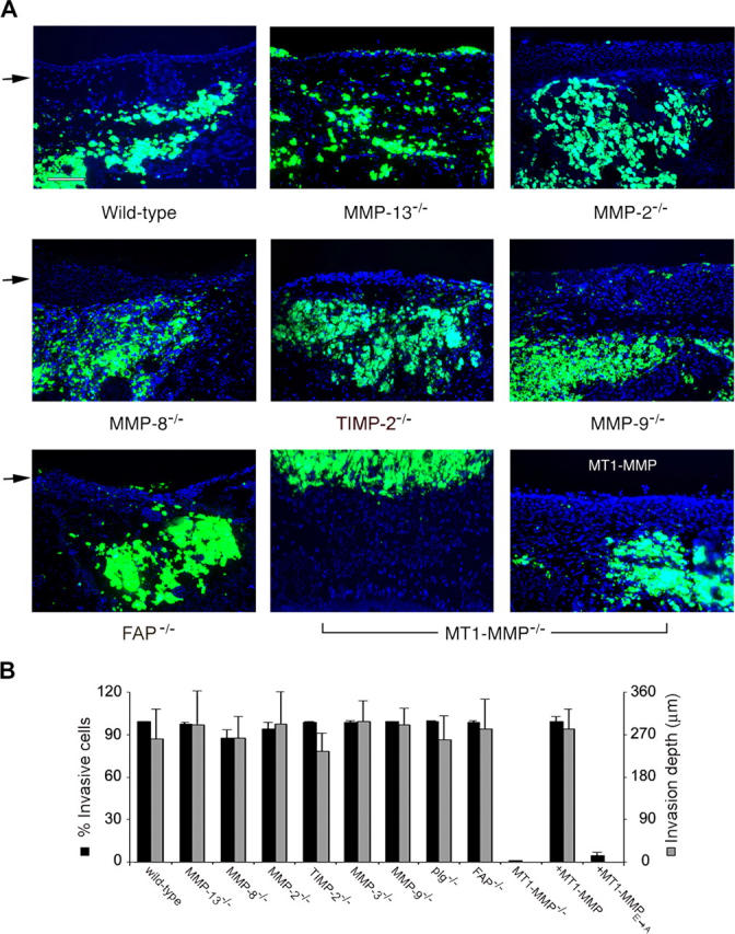 As cancer cells traverse collagen-rich extracellular matrix (ECM) barriers and intravasate, they adopt a fibroblast-like phenotype and engage undefined proteolytic cascades that mediate invasive activity. Herein, we find that fibroblasts and cancer cells express an indistinguishable pericellular collagenolytic activity that allows them to traverse the ECM. Using fibroblasts isolated from gene-targeted mice, a matrix metalloproteinase (MMP)-dependent activity is identified that drives invasion independently of plasminogen, the gelatinase A/TIMP-2 axis, gelatinase B, collagenase-3, collagenase-2, or stromelysin-1. In contrast, deleting or suppressing expression of the membrane-tethered MMP, MT1-MMP, in fibroblasts or tumor cells results in a loss of collagenolytic and invasive activity in vitro or in vivo. Thus, MT1-MMP serves as the major cell-associated proteinase necessary to confer normal or neoplastic cells with invasive activity.