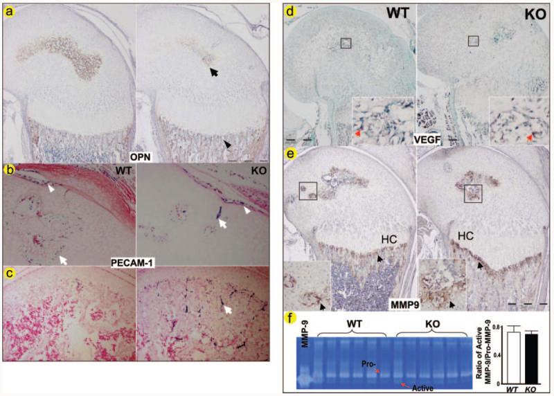 Understanding the molecular mechanisms by which cartilage formation is regulated is essential toward understanding the physiology of both embryonic bone development and postnatal bone growth. Although much is known about growth factor signaling in cartilage formation, the regulatory role of noncollagenous matrix proteins in this process are still largely unknown. In the present studies, we present evidence for a critical role of DMP1 (dentin matrix protein 1) in postnatal chondrogenesis. The Dmp1 gene was originally identified from a rat incisor cDNA library and has been shown to play an important role in late stage dentinogenesis. Whereas no apparent abnormalities were observed in prenatal bone development, Dmp1-deficient (Dmp1(-/-)) mice unexpectedly develop a severe defect in cartilage formation during postnatal chondrogenesis. Vertebrae and long bones in Dmp1-deficient (Dmp1(-/-)) mice are shorter and wider with delayed and malformed secondary ossification centers and an irregular and highly expanded growth plate, results of both a highly expanded proliferation and a highly expanded hypertrophic zone creating a phenotype resembling dwarfism with chondrodysplasia. This phenotype appears to be due to increased cell proliferation in the proliferating zone and reduced apoptosis in the hypertrophic zone. In addition, blood vessel invasion is impaired in the epiphyses of Dmp1(-/-) mice. These findings show that DMP1 is essential for normal postnatal chondrogenesis and subsequent osteogenesis.