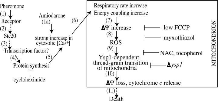 Although programmed cell death (PCD) is extensively studied in multicellular organisms, in recent years it has been shown that a unicellular organism, yeast Saccharomyces cerevisiae, also possesses death program(s). In particular, we have found that a high doses of yeast pheromone is a natural stimulus inducing PCD. Here, we show that the death cascades triggered by pheromone and by a drug amiodarone are very similar. We focused on the role of mitochondria during the pheromone/amiodarone-induced PCD. For the first time, a functional chain of the mitochondria-related events required for a particular case of yeast PCD has been revealed: an enhancement of mitochondrial respiration and of its energy coupling, a strong increase of mitochondrial membrane potential, both events triggered by the rise of cytoplasmic [Ca2+], a burst in generation of reactive oxygen species in center o of the respiratory chain complex III, mitochondrial thread-grain transition, and cytochrome c release from mitochondria. A novel mitochondrial protein required for thread-grain transition is identified.