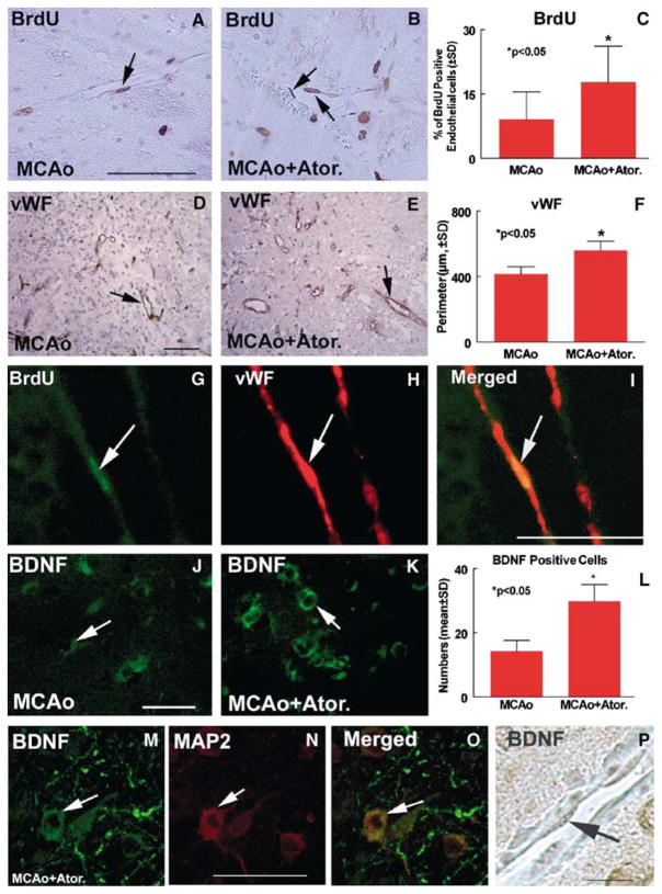 Molecular mechanisms underlying the role of statins in the induction of brain plasticity and subsequent improvement of neurologic outcome after treatment of stroke have not been adequately investigated. Here, we use both in vivo and in vitro studies to investigate the potential roles of two prominent factors, vascular endothelial growth factor (VEGF) and brain-derived neurotrophic factor (BDNF), in mediating brain plasticity after treatment of stroke with atorvastatin. Treatment of stroke in adult mice with atorvastatin daily for 14 days, starting at 24 hours after MCAO, shows significant improvement in functional recovery compared with control animals. Atorvastatin increases VEGF, VEGFR2 and BDNF expression in the ischemic border. Numbers of migrating neurons, developmental neurons and synaptophysin-positive cells as well as indices of angiogenesis were significantly increased in the atorvastatin treatment group, compared with controls. In addition, atorvastatin significantly increased brain subventricular zone (SVZ) explant cell migration in vitro. Anti-BDNF antibody significantly inhibited atorvastatin-induced SVZ explant cell migration, indicating a prominent role for BDNF in progenitor cell migration. Mouse brain endothelial cell culture expression of BDNF and VEGFR2 was significantly increased in atorvastatin-treated cells compared with control cells. Inhibition of VEGFR2 significantly decreased expression of BDNF in brain endothelial cells. These data indicate that atorvastatin promotes angiogenesis, brain plasticity and enhances functional recovery after stroke. In addition, VEGF, VEGFR2 and BDNF likely contribute to these restorative processes.