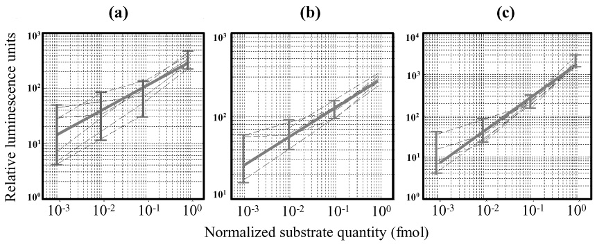 A novel application of bioluminescence for nucleic acid quantification, the bioluminescence regenerative cycle (BRC), is described in theoretical terms and supported by preliminary experimental data. In the BRC system, pyrophosphate (PPi) molecules are released during biopolymerization and are counted and correlated to DNA copy number. The enzymes ATP-sulfurylase and firefly luciferase are employed to generate photons quantitatively from PPi. Enzymatic unity-gain positive feedback is implemented to amplify photon generation and to compensate for decay in light intensity by self-regulation. The cumulative total of photons can be orders of magnitude higher than in typical chemiluminescent processes. A system level theoretical model is developed, taking into account the kinetics of the regenerative cycle, contamination, and detector noise. Data and simulations show that the photon generation process achieves steady state for the time range of experimental measurements. Based on chain reaction theory, computations show that BRC is very sensitive to variations in the efficiencies of the chemical reactions involved and less sensitive to variations in the quantum yield of the process. We show that BRC can detect attomolar quantities of DNA (10(-18) mol), and that the useful dynamic range is five orders of magnitude. Sensitivity is not constrained by detector performance but rather by background bioluminescence caused by contamination by either PPi or ATP (adenosine triphosphate).