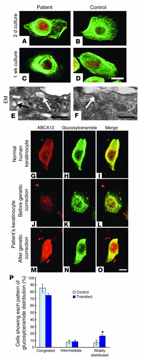Harlequin ichthyosis (HI) is a devastating skin disorder with an unknown underlying cause. Abnormal keratinocyte lamellar granules (LGs) are a hallmark of HI skin. ABCA12 is a member of the ATP-binding cassette transporter family, and members of the ABCA subfamily are known to have closely related functions as lipid transporters. ABCA3 is involved in lipid secretion via LGs from alveolar type II cells, and missense mutations in ABCA12 have been reported to cause lamellar ichthyosis type 2, a milder form of ichthyosis. Therefore, we hypothesized that HI might be caused by mutations that lead to serious ABCA12 defects. We identify 5 distinct ABCA12 mutations, either in a compound heterozygous or homozygous state, in patients from 4 HI families. All the mutations resulted in truncation or deletion of highly conserved regions of ABCA12. Immunoelectron microscopy revealed that ABCA12 localized to LGs in normal epidermal keratinocytes. We confirmed that ABCA12 defects cause congested lipid secretion in cultured HI keratinocytes and succeeded in obtaining the recovery of LG lipid secretion after corrective gene transfer of ABCA12. We concluded that ABCA12 works as an epidermal keratinocyte lipid transporter and that defective ABCA12 results in a loss of the skin lipid barrier, leading to HI. Our findings not only allow DNA-based early prenatal diagnosis but also suggest the possibility of gene therapy for HI.