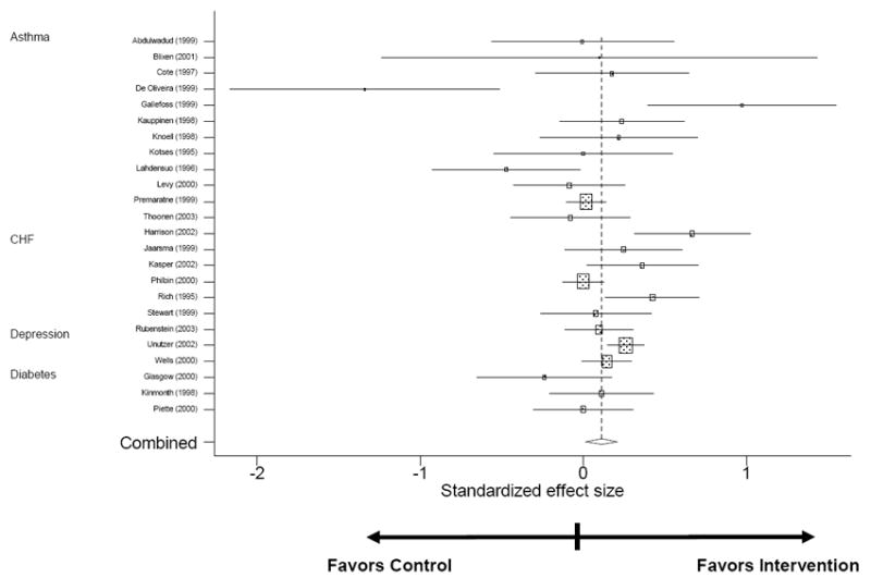 Methods: Articles were identified from narrative literature reviews and quantitative meta-analyses, each of which covered multiple bibliographic databases from inception to March 2003. We supplemented this strategy by searching the MEDLINE database (1998-2003) and by consulting experts. We included randomized and nonrandomized controlled trials of interventions that contained 1 or more elements of the CCM for asthma, congestive heart failure (CHF), depression, and diabetes. We extracted data on clinical outcomes, quality of life, and processes of care. We then used random-effects modeling to compute pooled standardized effect sizes and risk ratios.