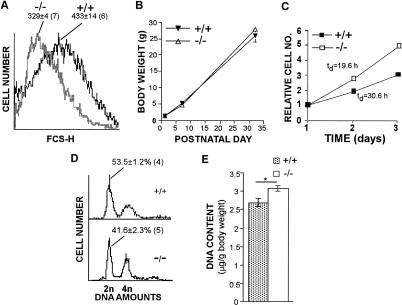 The regulated phosphorylation of ribosomal protein (rp) S6 has attracted much attention since its discovery in 1974, yet its physiological role has remained obscure. To directly address this issue, we have established viable and fertile knock-in mice, whose rpS6 contains alanine substitutions at all five phosphorylatable serine residues (rpS6(P-/-)). Here we show that contrary to the widely accepted model, this mutation does not affect the translational control of TOP mRNAs. rpS6(P-/-) mouse embryo fibroblasts (MEFs) display an increased rate of protein synthesis and accelerated cell division, and they are significantly smaller than rpS6(P+/+) MEFs. This small size reflects a growth defect, rather than a by-product of their faster cell division. Moreover, the size of rpS6(P-/-) MEFs, unlike wild-type MEFs, is not further decreased upon rapamycin treatment, implying that the rpS6 is a critical downstream effector of mTOR in regulation of cell size. The small cell phenotype is not confined to embryonal cells, as it also selectively characterizes pancreatic beta-cells in adult rpS6(P-/-) mice. These mice suffer from diminished levels of pancreatic insulin, hypoinsulinemia, and impaired glucose tolerance.