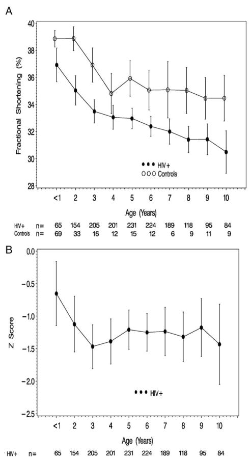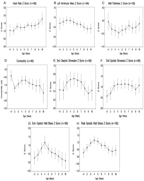 Methods: We describe longitudinal changes in left ventricular (LV) structure and function and mortality in 185 children vertically infected with HIV. Serial cardiac data were obtained from 0.1 to 10 years of age. Age- or body surface area-adjusted z scores were calculated for 10 echocardiographic outcomes.