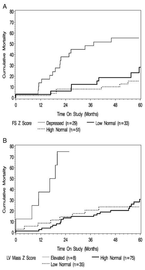 Results: Median age at first echocardiogram was 2 years (range 0.2-9.4 years); median follow-up was 3.6 years (range 0-6.3 years). The 5-year cumulative incidence of congestive heart failure was 12.3%. Mean fractional shortening z scores declined from -0.65 at 1 year of age to -1.47 at 3 years of age without further decline between 3 and 10 years of age. Among children with 2 echocardiograms performed in the first year of follow-up, mild LV dysfunction (fractional shortening of < -2 SD on both echocardiograms) was present in 29 (18%) of 158 children. For these 29 children, the 5-year mortality was 55.4%. Left ventricular mass z scores were elevated at 1 year (mean z score 0.68, P < .001) and remained elevated throughout follow-up. In the 8 children with LV mass z score of > 2 SD on both initial and follow-up echocardiograms, the 5-year mortality was 75%.