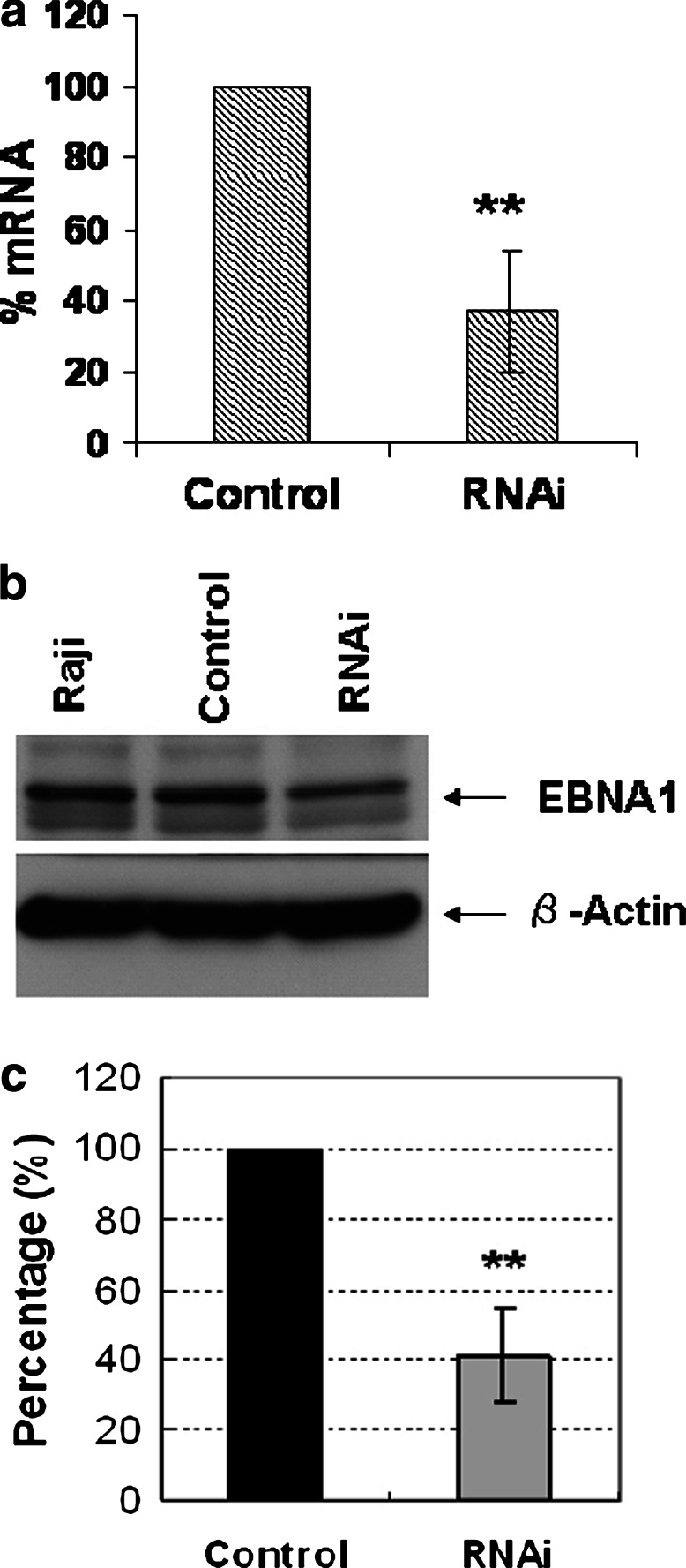 Results: Transfection of an EBNA1 RNAi plasmid resulted in substantial loss of EBNA1 mRNA and significantly inhibited proliferation of Raji cells relative to the control plasmid case. Suppression of EBNA1 was also associated with downregulation of EBV oncogene EBNA2, a decreased PCNA labeling index and increased G0/G1 fraction in cell cycle analysis.