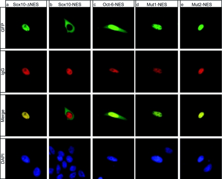 Like many POU domain proteins, Oct-6 plays important roles during vertebrate development. In accord with its function as a transcriptional regulator during neurogenesis and myelination, Oct-6 is predominantly found in the nucleus. Nuclear import is mediated by a nuclear localization signal at the N-terminal end of the POU homeodomain. Here we show, that Oct-6 in addition contains a nuclear export signal so that Oct-6 is able to shuttle constantly between nucleus and cytoplasm. This nuclear export signal is also localized in the POU homeodomain as part of helix 2 and the connecting loop to DNA recognition helix 3. It conforms to the consensus of hydrophobic leucine-rich export sequences and mediates export from the nucleus via CRM1/Exp1. Several amino acid substitutions or insertions that inactivate this nuclear export sequence, reduce DNA-binding of Oct-6 to its octamer recognition element slighty, but interfere strongly with Oct-6-dependent transcriptional activation, thus arguing that nuclear export and nucleocytoplasmic shuttling are essential aspects of Oct-6 function. Importantly, the nuclear export signal identified for Oct-6 is conserved in most, if not all other vertebrate POU proteins. Nuclear export might therefore be of general relevance for POU protein function throughout development.