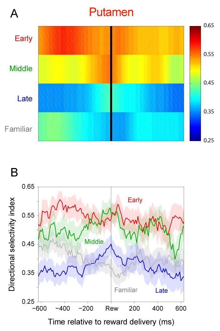 A previous study found that as monkeys learned novel mappings between visual cues and responses, neuronal activity patterns evolved at approximately the same time in both the dorsal premotor cortex (PMd) and the putamen. Here we report that, in both regions, the population activity for novel mappings came to resemble that for familiar ones as learning progressed. Both regions showed activity differences on trials with correct responses versus those with incorrect ones. In addition to these common features, we observed two noteworthy differences between PMd and putamen activity during learning. After a response choice had been made, but prior to feedback about the correctness of that choice (reward or nonreward), the putamen showed a sustained activity increase in activity, whereas PMd did not. Also in the putamen, this prereward activity was highly selective for the specific visuomotor mapping that had just been performed, and this selectivity was maintained until the time of the reward. After performance reached an asymptote, the degree of this selectivity decreased markedly to the level typical for familiar visuomotor mappings. These findings support the hypothesis that neurons in the striatum play a pivotal role in associative learning.