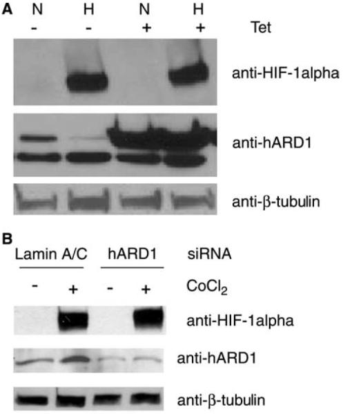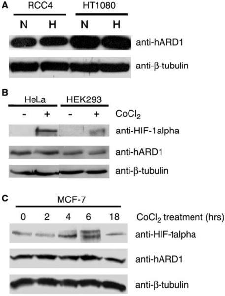 Hypoxia inducible factor-1 alpha (HIF-1 alpha) is a central component of the cellular responses to hypoxia. Hypoxic conditions result in stabilization of HIF-1 alpha and formation of the transcriptionally active HIF-1 complex. It was suggested that mammalian ARD1 acetylates HIF-1 alpha and thereby enhances HIF-1 alpha ubiquitination and degradation. Furthermore, ARD1 was proposed to be down-regulated in hypoxia thus facilitating the stabilization of HIF-1 alpha. Here we demonstrate that the level of human ARD1 (hARD1) protein is not decreased in hypoxia. Moreover, hARD1 does not acetylate and destabilize HIF-1 alpha. However, we find that hARD1 specifically binds HIF-1 alpha, suggesting a putative, still unclear, connection between these proteins.