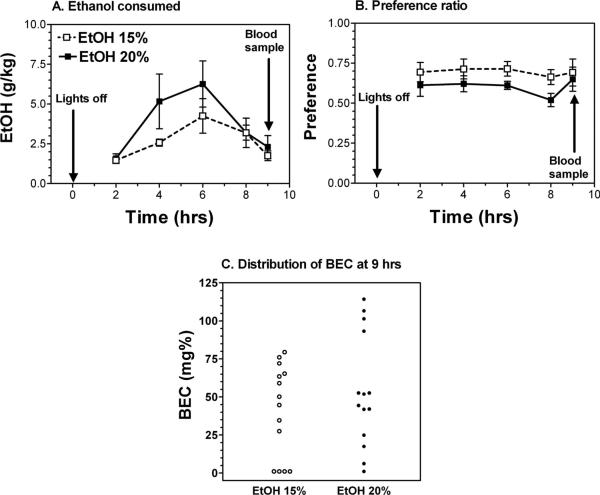 Background: From several recent strain surveys (28 strains: Bachmanov et al., personal communication; 22 strains: Finn et al., unpublished), and from data in >100 other published studies of 24-hr two-bottle ethanol preference, it is known that male C57BL/6 (B6) mice self-administer about 10-14 g/kg/day and that female B6 mice self-administer about 12-18 g/kg/day. No strain has been found to consume more ethanol than B6. In one of our laboratories (Texas), we noted a markedly greater intake of ethanol in an F1 hybrid of B6 and FVB/NJ (FVB) mice.