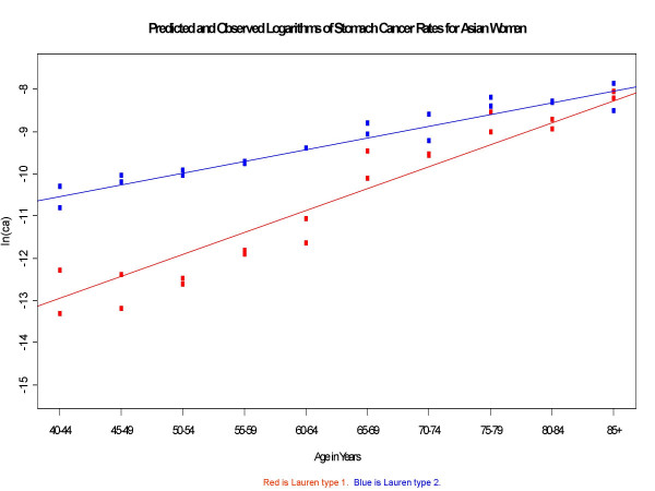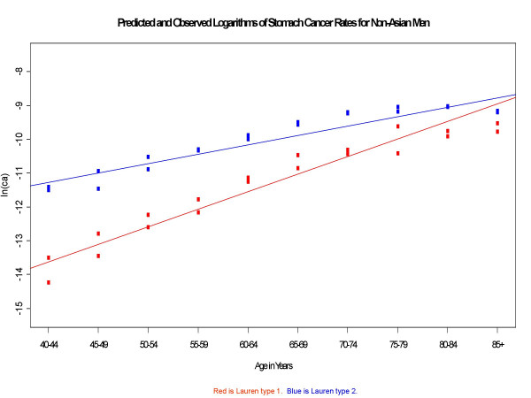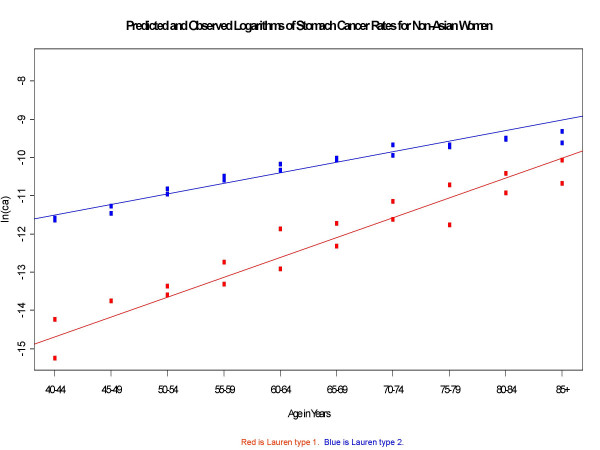 Conclusion: The change of the incidence of stomach cancer with respect to age for Lauren type 1 stomach cancer differs from that for Lauren type 2 stomach cancers. The relationships between age and Lauren type do not differ across gender or race. The results support the notion that Lauren type 1 and Lauren type 2 gastric cancers have different etiologies and different patterns of progression from pre-cancer to cancer. The results should be validated by evaluation of other databases.