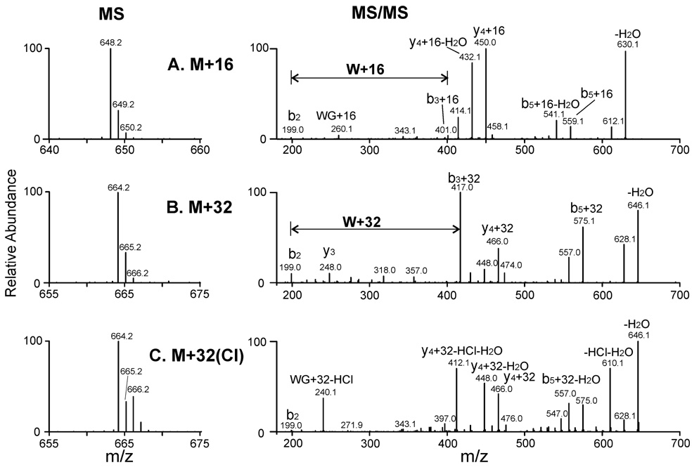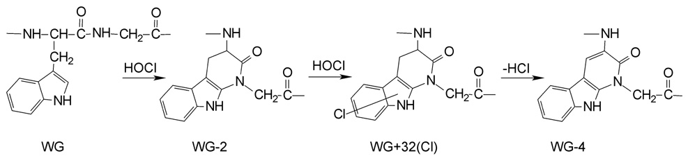 Most studies of protein oxidation have typically focused on the reactivity of single amino acid side chains while ignoring the potential importance of adjacent sequences in directing the reaction pathway. We previously showed that hypochlorous acid (HOCl), a specific product of myeloperoxidase, inactivates matrilysin by modifying adjacent tryptophan and glycine (WG) residues in the catalytic domain. Here, we use model peptides that mimic the region of matrilysin involved in this reaction, VVWGTA, VVWATA, and the library VVWXTA, to determine whether specific sequence motifs are targeted for chlorination or oxygenation by myeloperoxidase. Our results demonstrate that HOCl generated by myeloperoxidase or activated neutrophils converts the peptide VVWGTA to a chlorinated product, WG+32(Cl). Tandem mass spectrometry in concert with high resolution 1H and two-dimensional NMR analysis revealed that the modification required cross-linking of the tryptophan to the amide of glycine followed by chlorination of the indole ring of tryptophan. In contrast, when glycine in the peptide was replaced with alanine, the major products were mono- and dioxygenated tryptophan residues. When the peptide library VVWXTA (where X represents all 20 common amino acids) was exposed to HOCl, only WG produced a high yield of the chloroindolenine derivative. However, when glycine was replaced by other amino acids, oxygenated tryptophan derivatives were the major products. Our observations indicate that WG may represent a specific sequence motif in proteins that is targeted for chlorination by myeloperoxidase.