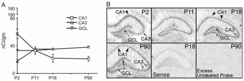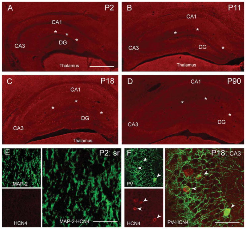 The properties of the hyperpolarization-activated current (I(h)) and its roles in hippocampal network function evolve radically during development. Because I(h) is conducted by the hyperpolarization-activated cyclic nucleotide-gated (HCN) cation channels, we tested the hypothesis that understanding the quantitative developmental profiles of HCN1, HCN2, and HCN4 expression, and the isoform- and age-specific progression of their subcellular distribution, should shed light on the established modifications of the properties of I(h) throughout development. Combined quantitative in situ hybridization, regional western blots, and high-resolution, dual-label immunocytochemistry revealed striking and novel information about the expression and distribution of the HCN channel isoforms in the developing hippocampal formation. In cornus ammon 1 (CA) pyramidal cell layer, a robust increase of HCN1 mRNA and protein expression occurred with age, with reciprocal reduction of HCN4 and relatively stable HCN2 levels. These distinct expression patterns raised the contribution of HCN1 to the total HCN channel pool from 33% to 65% consonant with acceleration and reduced cyclic adenosine mono phosphate (cAMP) sensitivity of I(h) in this region with age. In CA3, strong expression of HCN1 already neonatally supports the recently established role of this conductance in neonatal, age-specific, hippocampal oscillations (giant depolarizing potentials). Notably, HCN1 channels were present and probably transported to dendritic compartments already on postnatal day (P) 2, whereas HCN2 channel protein was not evident in dendrites for the first 2 weeks of life. HCN2 mRNA and protein expression remained fairly constant subsequent to the first week of life in all hippocampal subfields examined, whereas HCN4 mRNA and protein expression declined after maximal neonatal expression, so that the contribution of this isoform to the total HCN channel pool dropped from 43% (CA1) and 34% (CA3) on P11 to 8% (CA1) and 19% (CA3) on P90. Interneuronal expression of all HCN channel isoforms in stratum pyramidale was robust in parvalbumin-but not in cholecystokinin-expressing populations and with a subunit-specific subcellular distribution. Taken together, these data suggest that early in life, HCN4 may contribute significantly to the functions of I(h) in specific hippocampal regions. In addition, these evolving, differential quantitative, and subcellular expression patterns of the HCN channel isoforms support age-specific properties and functions of I(h) within the developing hippocampal formation.