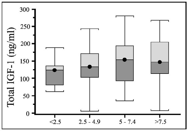 Observational studies have shown that the use of angiotensin-converting enzyme (ACE) inhibitors is associated with the maintenance of greater muscle strength and physical performance in older subjects. However, the mechanism that underlies these beneficial effects remains poorly understood. Because ACE inhibitors block the production of angiotensin II, which is a potent inhibitor of insulin-like growth factor-1 (IGF-1) production, it was hypothesized that treatment with ACE inhibitors is associated with higher levels of IGF-1. This hypothesis was tested in 745 subjects (417 women, 328 men) enrolled in the Invecchiare in Chianti study. Of these, 160 were receiving ACE inhibitors. The association between ACE inhibitor use and serum IGF-1 was tested by linear regression models. After adjusting for multiple potential confounders, serum levels of total IGF-1 were significantly higher in participants receiving ACE inhibitors (mean +/- SD 129.0 +/- 56.1 ng/ml) compared with the rest of the study population (mean +/- SD 116.5 +/- 54.8 ng/ml) (p <0.001). Participants with short (<3 years) and long (3 to 9 years) treatment durations had higher serum IGF-1 levels than participants who were not receiving ACE inhibitor treatment, but the difference was statistically significant only for the short-duration group (p <0.05). In conclusion, in older subjects, treatment with ACE inhibitors for <3 years is associated with significantly higher levels of IGF-1. This may be 1 of the mechanisms by which ACE inhibitors might slow the decreases in muscle strength and physical function that are often observed in older subjects.