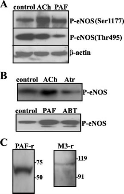 Nitric oxide (NO) regulates flow and permeability. ACh and platelet-activating factor (PAF) lead to endothelial NO synthase (eNOS) phosphorylation and NO release. While ACh causes only vasodilation, PAF induces vasoconstriction and hyperpermeability. The key differential signaling mechanisms for discriminating between vasodilation and hyperpermeability are unknown. We tested the hypothesis that differential translocation may serve as a regulatory mechanism of eNOS to determine specific vascular responses. We used ECV-304 cells permanently transfected with eNOS-green fluorescent protein (ECVeNOS-GFP) and demonstrated that the agonists activate eNOS and reproduce their characteristic endothelial permeability effects in these cells. We evaluated eNOS localization by lipid raft analysis and immunofluorescence microscopy. After PAF and ACh, eNOS moves away from caveolae. eNOS distributes both in the plasma membrane and Golgi in control cells. ACh (10(-5) M, 10(-4) M) translocated eNOS preferentially to the trans-Golgi network (TGN) and PAF (10(-7) M) preferentially to the cytosol. We suggest that PAF-induced eNOS translocation preferentially to cytosol reflects a differential signaling mechanism related to changes in permeability, whereas ACh-induced eNOS translocation to the TGN is related to vasodilation.