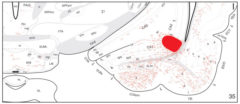 Analysis of direct hippocampal cortical field CA1 axonal projections to diencephalon in the rat