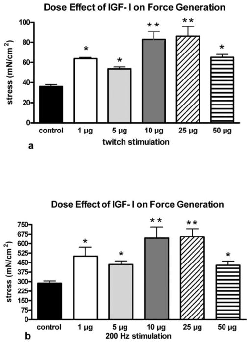 Methods: Adult rabbits received a single injection of IGF-I at one of several doses into one superior rectus muscle. One week after treatment, the rabbits were euthanatized, and the superior rectus muscle from each orbit was removed. Force generation was measured using an in vitro apparatus, and injected muscles were compared with the contralateral control. A second group of animals were injected similarly, and the muscles were examined at 1 week for changes in cross-sectional area of individual myofibers.