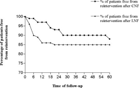 Results: A total of 148 patients agreed to participate in the follow-up study: 79 patients after LNF and 69 after CNF. Of these, 97 patients (48 LNF, 49 CNF) consented to undergo esophageal manometry and 24-hour pH-metry. At 5 years follow-up, 20 patients had undergone reoperation: 12 after LNF (15%) and 8 after CNF (12%). There was no difference in subjective outcome, with overall satisfaction rates of 88% and 90%, respectively. Total esophageal acid exposure times (pH < 4) were 2.1% +/- 0.5% and 2.0% +/- 0.6%, respectively (P = 0.21). Antisecretory medication was taken daily in 14% and 16%, respectively (P = 0.29). There was no correlation between medication use and acid exposure and indices of symptom-reflux association (symptom index and symptom association probability). No significant differences between subjective and objective results at 3 to 6 months and results obtained at 5 years after surgery were found.