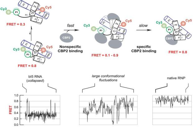 Like most cellular RNA enzymes, the bI5 group I intron requires binding by a protein cofactor to fold correctly. Here, we use single-molecule approaches to monitor the structural dynamics of the bI5 RNA in real time as it assembles with its CBP2 protein cofactor. These experiments show that CBP2 binds to the target RNA in two distinct modes with apparently opposite effects: a "non-specific" mode that forms rapidly and induces large conformational fluctuations in the RNA, and a "specific" mode that forms slowly and stabilizes the native RNA structure. The bI5 RNA folds though multiple pathways toward the native state, typically traversing dynamic intermediate states induced by non-specific binding of CBP2. These results suggest that the protein cofactor-assisted RNA folding involves sequential non-specific and specific protein-RNA interactions. The non-specific interaction potentially increases the local concentration of CBP2 and the number of conformational states accessible to the RNA, which may promote the formation of specific RNA-protein interactions.