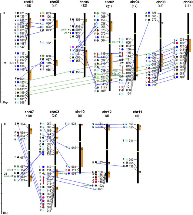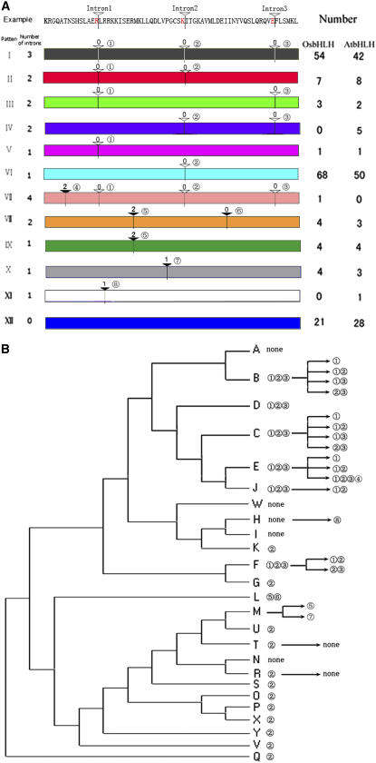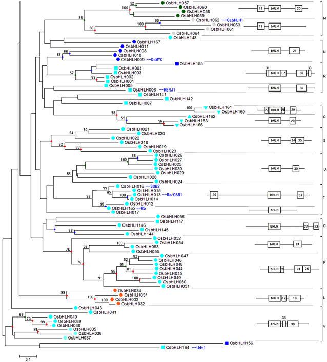 The basic/helix-loop-helix (bHLH) transcription factors and their homologs form a large family in plant and animal genomes. They are known to play important roles in the specification of tissue types in animals. On the other hand, few plant bHLH proteins have been studied functionally. Recent completion of whole genome sequences of model plants Arabidopsis (Arabidopsis thaliana) and rice (Oryza sativa) allows genome-wide analysis and comparison of the bHLH family in flowering plants. We have identified 167 bHLH genes in the rice genome, and their phylogenetic analysis indicates that they form well-supported clades, which are defined as subfamilies. In addition, sequence analysis of potential DNA-binding activity, the sequence motifs outside the bHLH domain, and the conservation of intron/exon structural patterns further support the evolutionary relationships among these proteins. The genome distribution of rice bHLH genes strongly supports the hypothesis that genome-wide and tandem duplication contributed to the expansion of the bHLH gene family, consistent with the birth-and-death theory of gene family evolution. Bioinformatics analysis suggests that rice bHLH proteins can potentially participate in a variety of combinatorial interactions, endowing them with the capacity to regulate a multitude of transcriptional programs. In addition, similar expression patterns suggest functional conservation between some rice bHLH genes and their close Arabidopsis homologs.