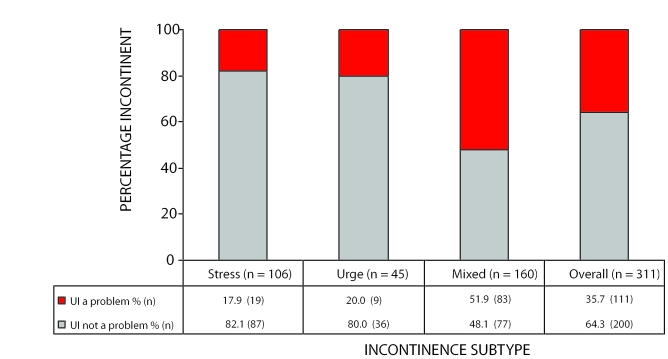 Results: Overall response rate was 61% (606/992); 51% (311/606; 95% confidence interval 47.3% to 55.3%) reported an episode of UI during the last month. Of the 311 women reporting UI, 35.7% perceived it as a problem, 27% had had it for less than a year, 41.9% had had it for 1 to 4 years, and 31.1% had had it for 5 years or longer. Three kinds of UI were reported: 34% (106/311) reported stress UI, 14.5% (45/311) reported urge UI, and 51.4% (160/311) reported a mixed pattern. In multivariate analysis, the overall prevalence of incontinence increased significantly with "usually having a cough," "being troubled by swollen ankles," "giving birth," "ever smoking cigarettes," and "being troubled by headaches." Stress UI was associated with "usually having a cough" and "ever smoking cigarettes." Urge UI was associated with "having troubles with constipation" and "swollen ankles." Mixed incontinence was associated with "get sick more than other people," "usually having a cough," "taken hormones for menopause," and body mass index in the 50th to 75th percentile or greater. Age was not significantly associated with prevalence of UI or any of its subtypes. Only 40% of incontinent women indicated they had discussed urine loss with their physicians; 70% of these women felt satisfied with physicians' responses.